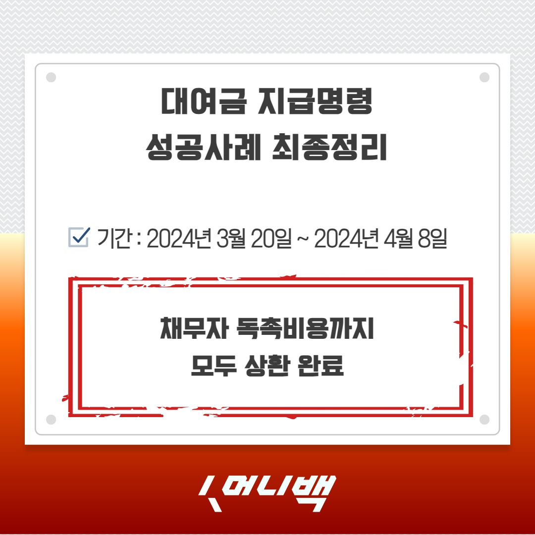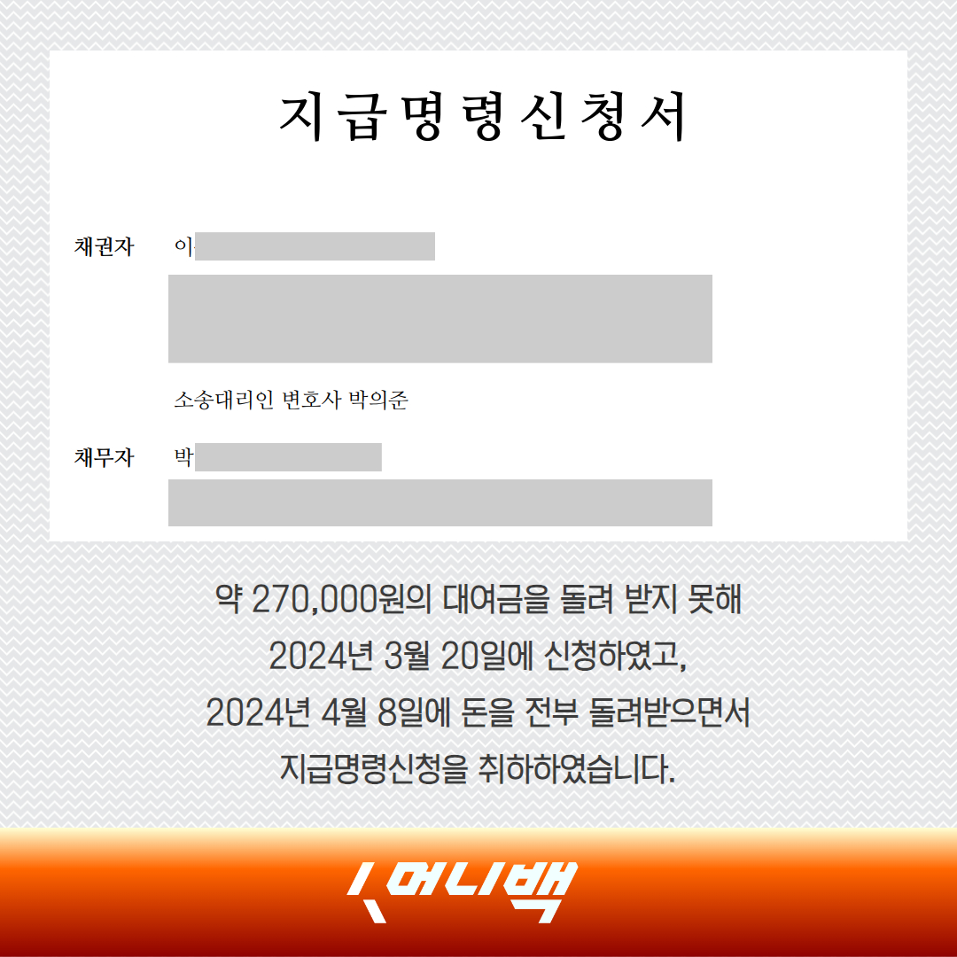 | 지급명령신청비용 가장 합리적인 선택 (머니백 성공사례) (0) | 2024.04.11 |