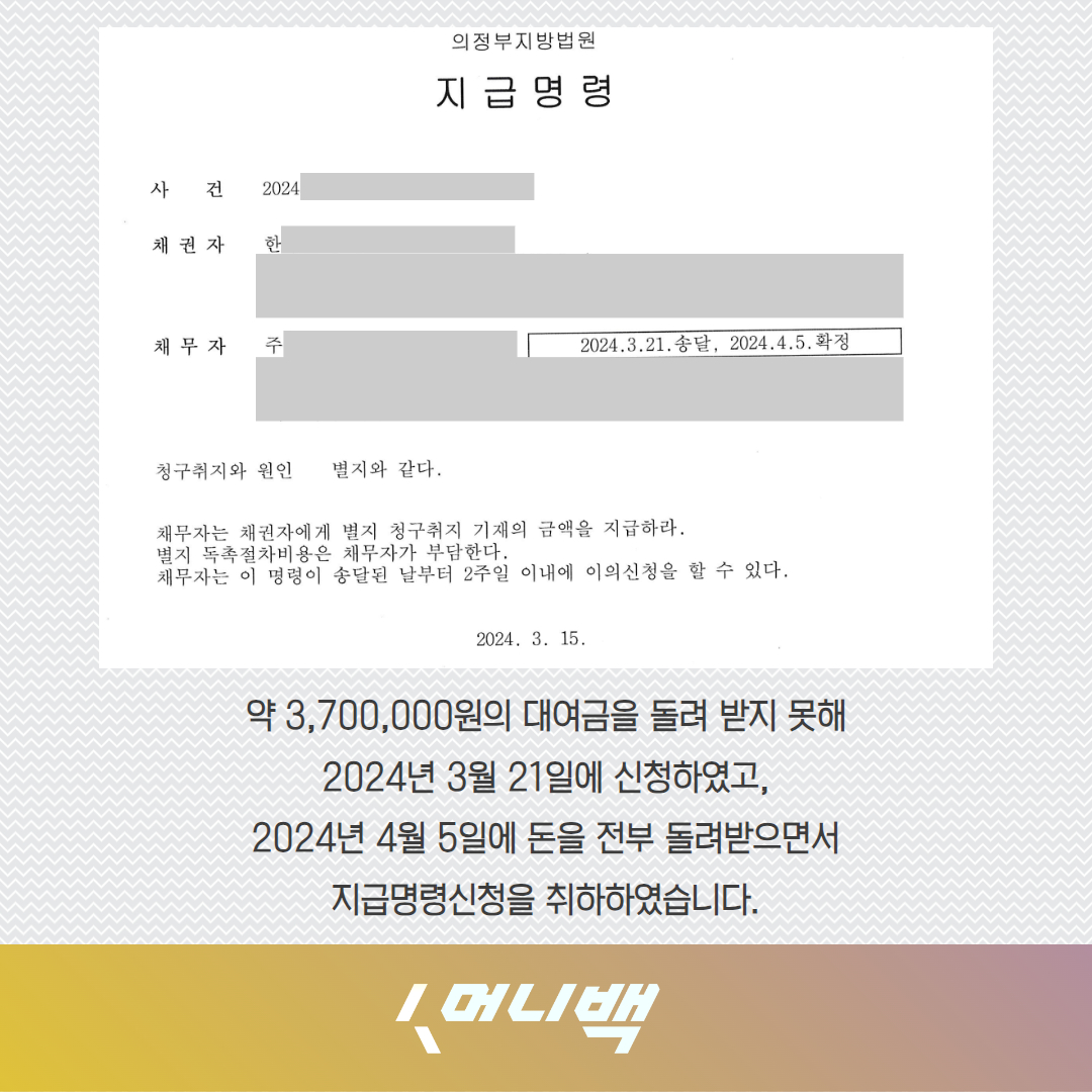 | 대여금청구 지급명령성공사례! 못받은돈은 확실하게 받자 (0) | 2024.04.16 |
