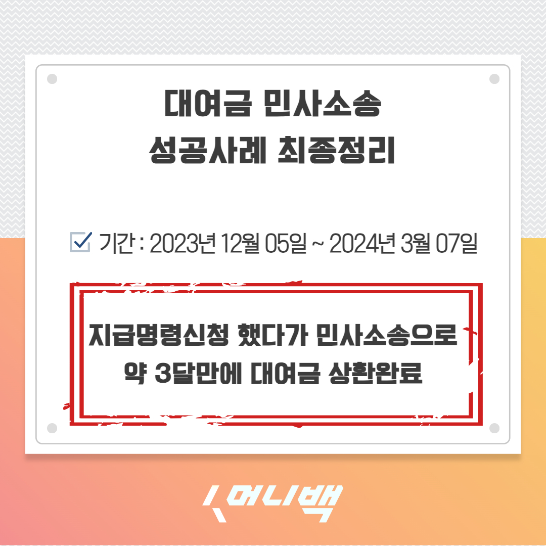 | 지급명령신청비용 가장 합리적인 선택 (머니백 성공사례) (0) | 2024.04.11 |
