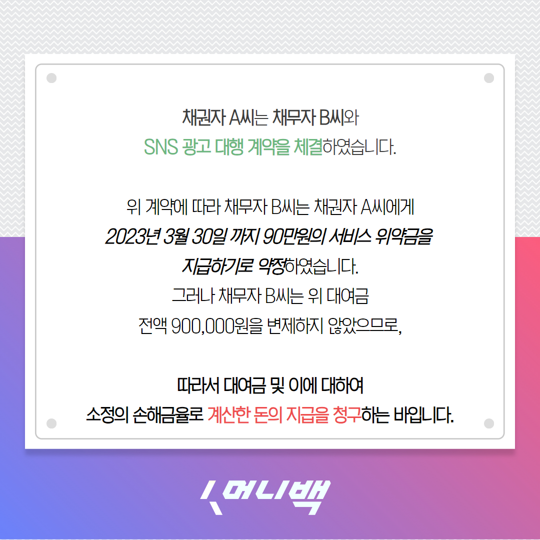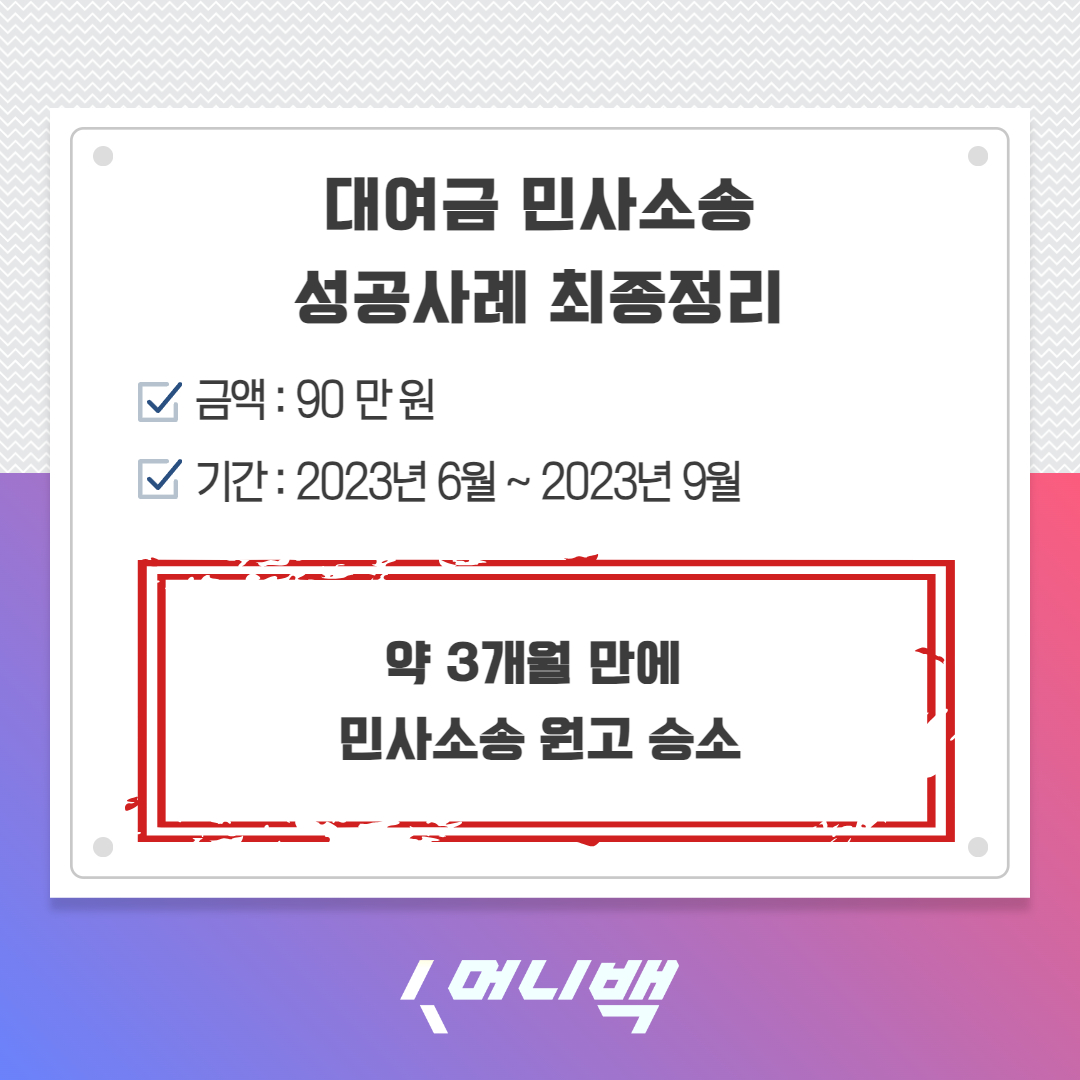 | [소액민사소송] 못받은돈 받은, 머니백 대여금 후기 (0) | 2024.02.16 |