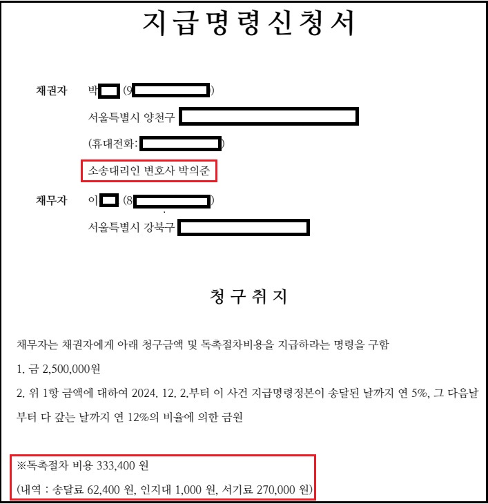 지급명령 신청서 예시(지급명령 신청서를 보면 변호사가 대리인으로 선임되어 신청서를 작성함. 또한 서비스 이용료, 법원에 납부하는 송달료, 인지대 및 특별송달료까지 모두 상대방이 부담하도록 신청서가 작성되어 있음)