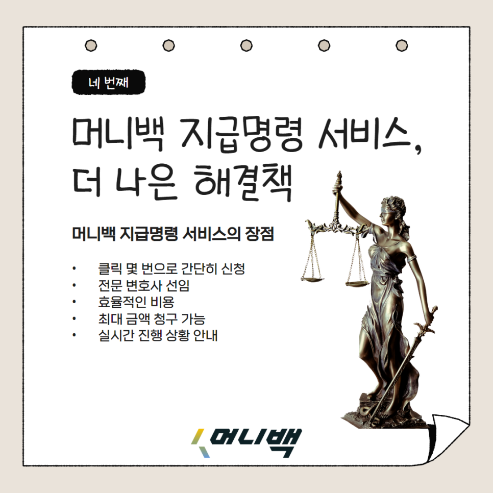 머니백은 지급명령 절차를 간편하고 신속하게 처리할 수 있는 전문 서비스입니다.