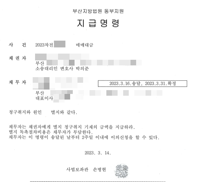 상대방은 법원에서 문서를 받은 즉시 연락하여 대금을 지급하며 사건이 종결되었습니다.