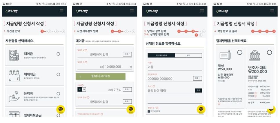 "머니백"은 카이스트 출신 변호사들이 만든 비대면 자동화 법률 서비스로, 온라인으로 5분 만에 지급명령 신청을 완료할 수 있습니다.