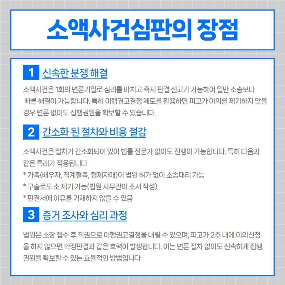 3,000만원 이하의 금전 청구는 '소액사건심판'으로 진행되어 다음과 같은 장점이 있습니다: