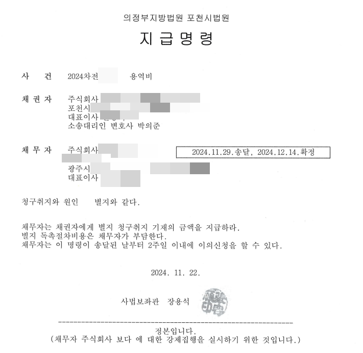 상대방은 지급명령 확정 후 일주일 만에 전액을 지급하였습니다.