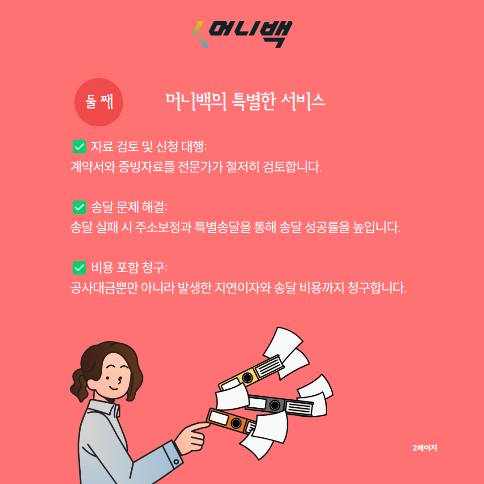 머니백은 공사대금 청구를 효율적으로 처리하며, 고객의 손실을 최소화합니다.