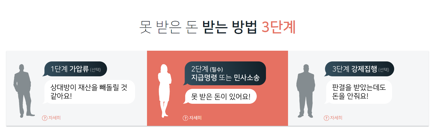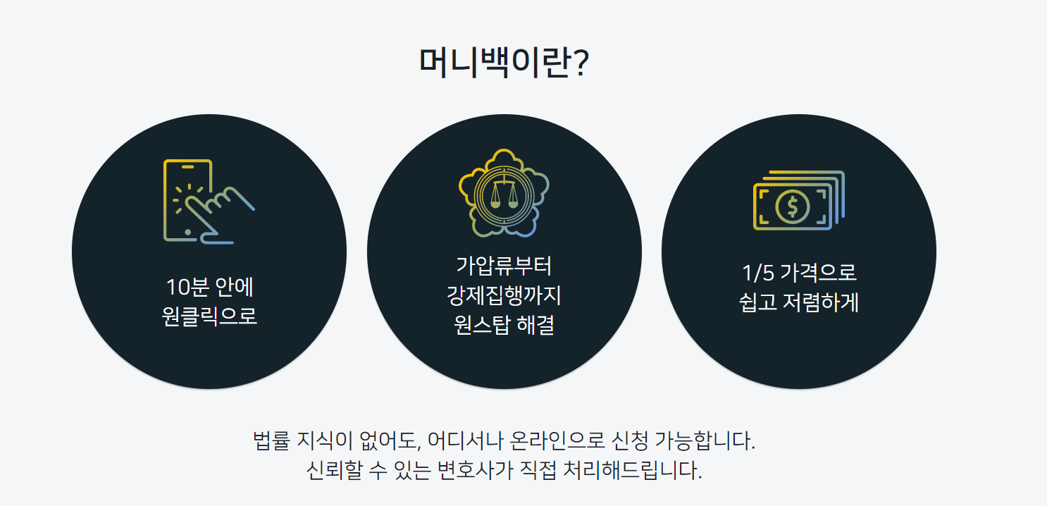 머니백은 가압류, 지급명령신청, 강제집행까지 간단하게 진행할 수 있습니다. 클릭만 하면 5~10분 안에 신청이 가능하고 지급명령, 가압류, 민사소송이 자동으로 처리되어 신경 쓸 필요가 없습니다. 첨단기술을 이용하여 최대금액까지 받을 수 있는 법률 서비스입니다.