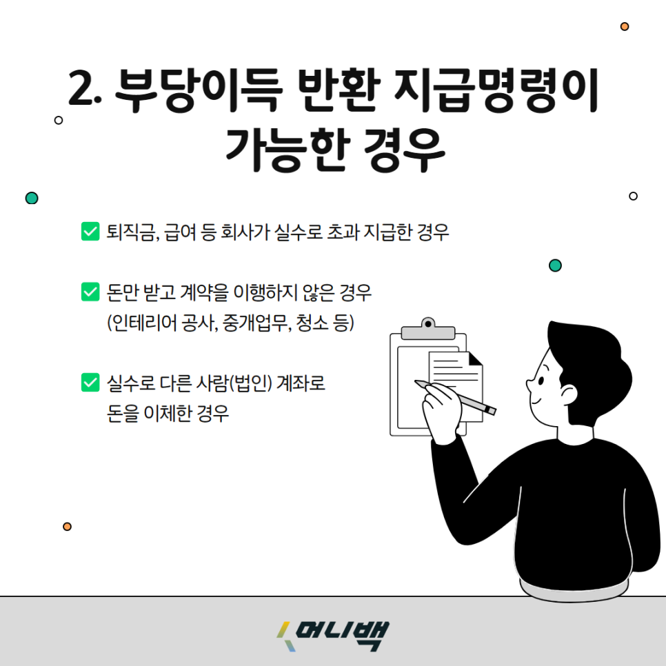 퇴직금, 급여, 계약금 등 실수로 잘못 지급된 금액을 돌려받고 싶다면, 상대방이 돈만 받고 일을 처리하지 안 했다면, 머니백의 지급명령 서비스를 이용하세요. 법적 절차를 간단하게 진행하면서도 확실한 법적 강제력을 가질 수 있습니다. 더 이상 고민하지 말고, 정당한 권리를 되찾기 위해 머니백을 활용하세요.