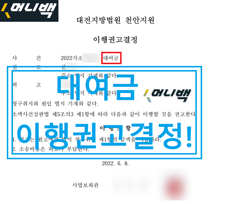 그리고 한달만인 2022년 6월 한씨는 머니백 대여금 민사소송 이행권고결정문을 받아볼 수 있었습니다.
