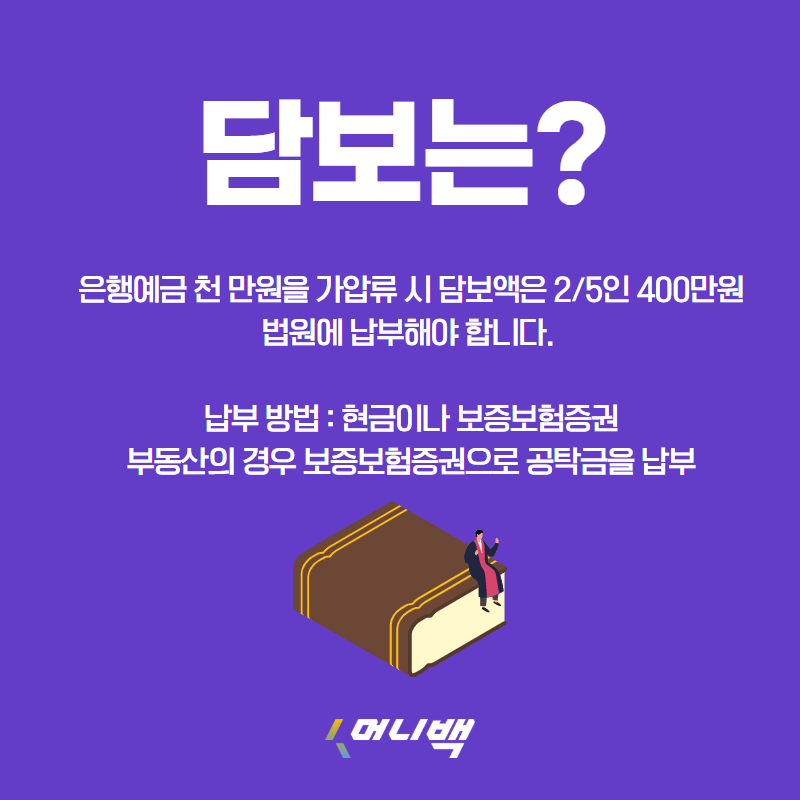 예를 들어 은행예금 천 만원을 가압류 한다고 가정했을 때 담보액은 2/5입니다. 담보금은 400만원이고 법원에 납부해야 합니다. 납부는 현금이나 보증보험증권으로 납부할 수 있는데요. 은행예금의 경우 현금과 보증보험증권을 혼합해서 납부할 수 있고, 부동산은 보증보험증권으로 공탁금을 납부합니다.